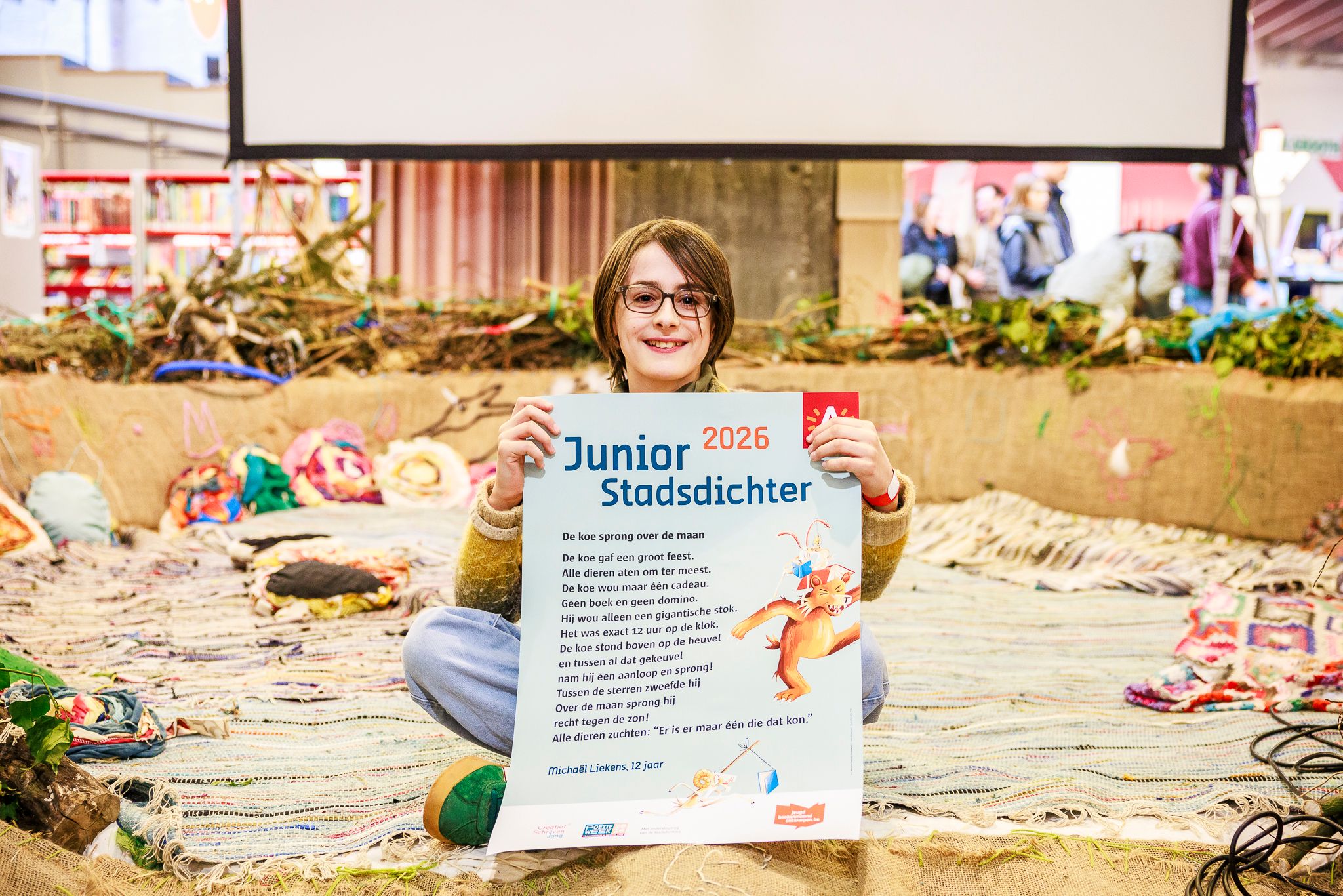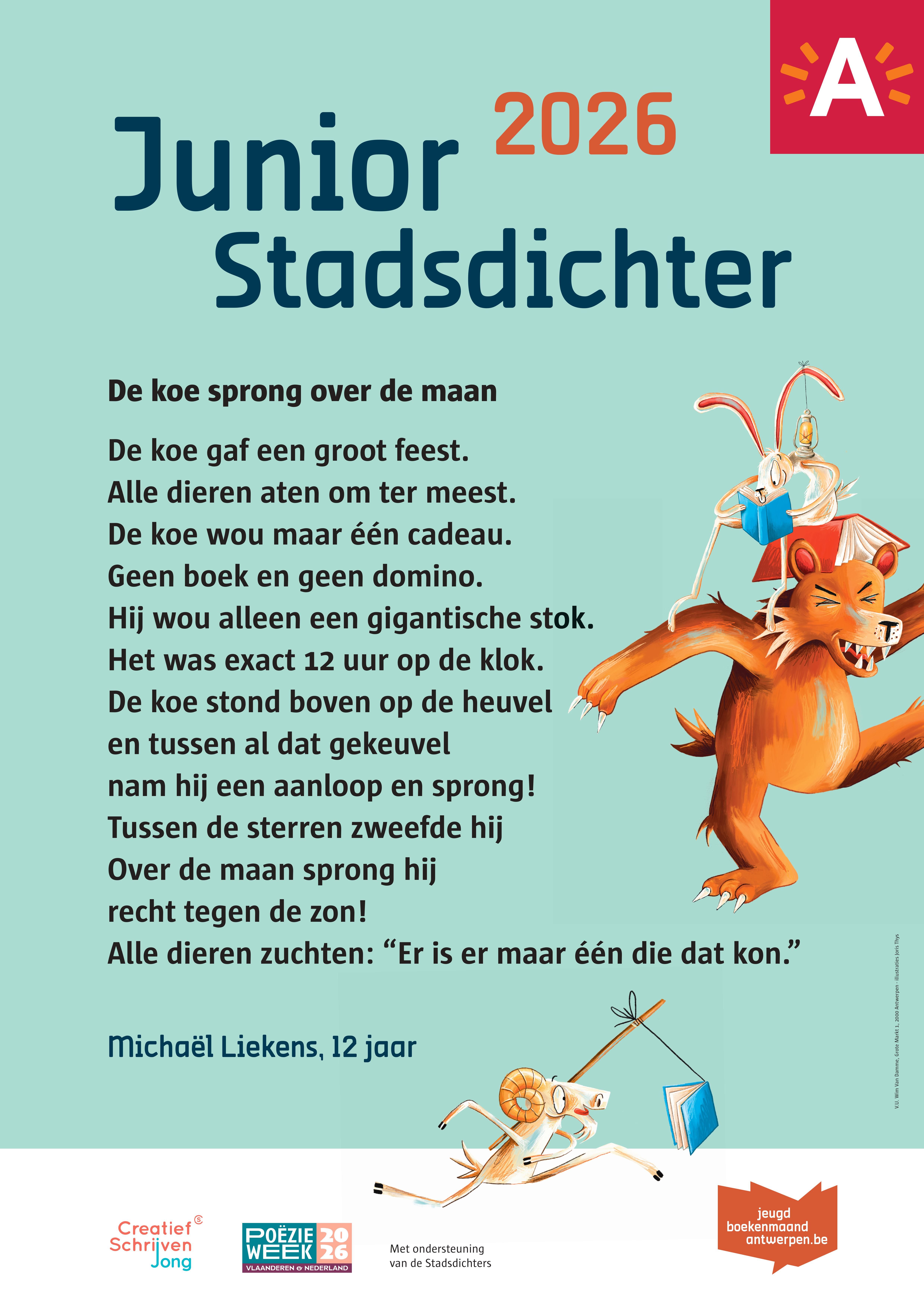 Op zaterdag 28 februari – tijdens het openingsfeest van de Jeugdboekenmaand – riep Ketnetheld Dempsey Hendrickx de 12-jarige Michaël Liekens uit als allereerste Junior Stadsdichter van Antwerpen. Michaël overtuigde de jury met zijn gedicht 'De koe sprong over de maan' en mag zich nu een jaar lang Junior Stadsdichter noemen!